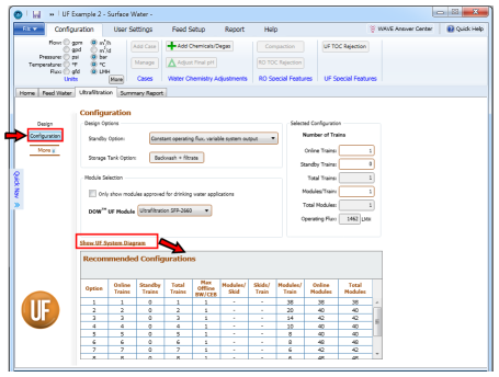 Based on the information provided in the Design and Configuration Windows, WAVE generated the UF process flow diagram as shown in Figure 1. It is shown interchangeably with the Recommended Configurations Table. One can generate the UF System Diagram by clicking on the “Show UF System Diagram” button as shown in Figure 1. The user can restore the Recommended Configurations Table by clicking on the “Show Recommended Configurations” button as shown in Figure 1.