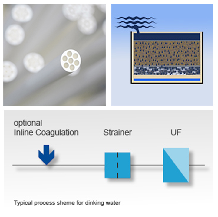 Nowadays drinking water is produced using ultra filtration technology with nanoscale membranes. Thanks to their extremely small pore size, our Multibore® membranes reliably intercept not only particles but also microorganisms such as bacteria and even viruses, thereby providing a dependable source of clean water. This method is more reliable and requires considerably less space than sand filtration. It is simple to operate and can easily be incorporated in complex water treatment plants as either an upstream or downstream stage.