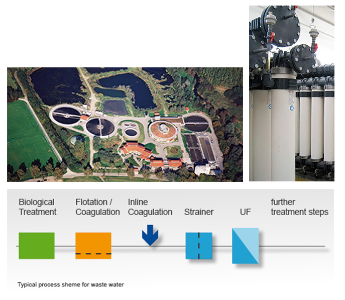 Wastewater is water that has become contaminated through use. It includes household sewage, municipal wastewater, industrial effluent, collected rainwater and surface runoff, i.e. water that flows off paved surfaces. Wastewater treatment is generally carried out in three to four stages in centrally located sewage works. The cleaning stages typically include physical, biological and chemical processes. To ensure that the water that leaves the sewage works is genuinely clean, however, a further stage is required to remove pathogenic germs and viruses. This is where ultrafiltration technology can be used to purify the wastewater without requiring any additional chemical treatment.