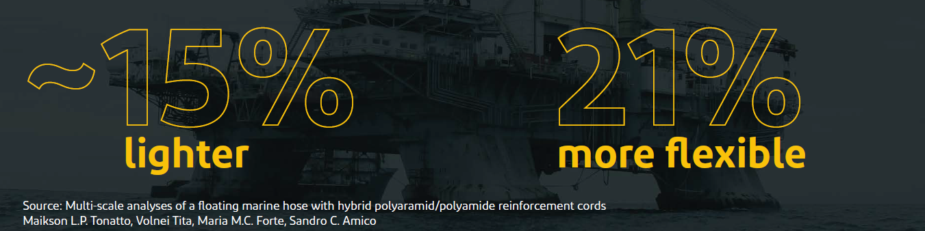 Kevlar® offers significant advantages for floating hoses in offshore oil and gas applications by making them lighter, more flexible and durable. Its high strength-to-weight ratio reduces the hose’s weight, easing transport, handling and improving buoyancy, while its flexibility allows hoses to move smoothly with ocean currents, reducing stress on connectors.