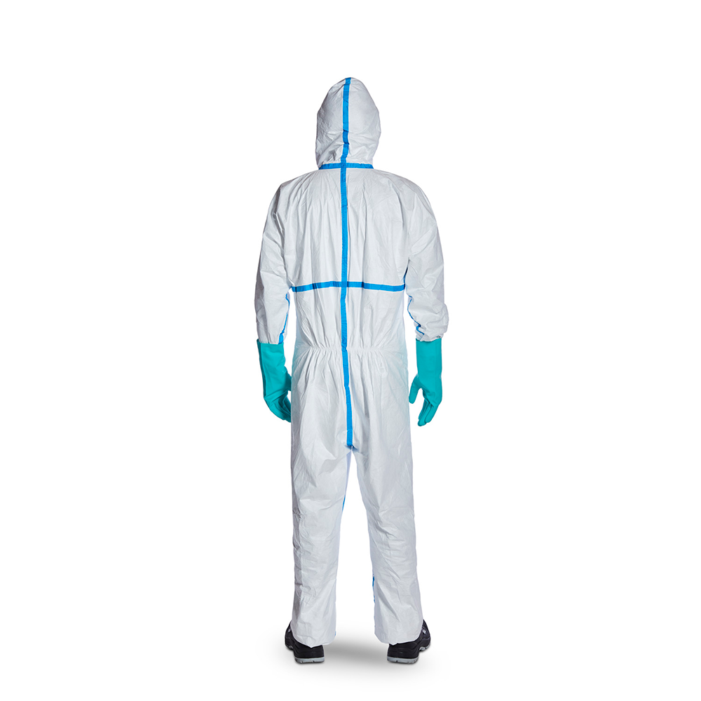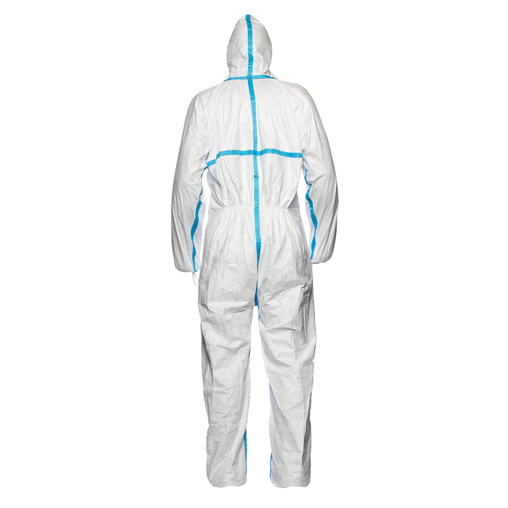 | Design | Hooded coverall with elastics and thumb loops |