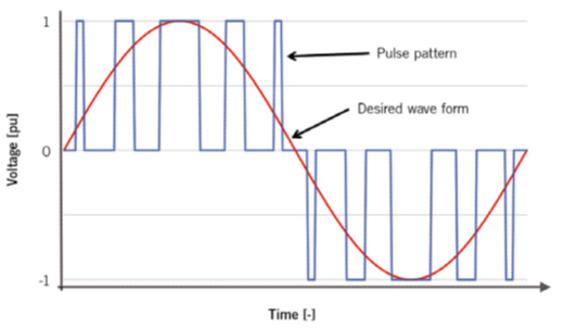 Traction motors in electric drives are typically powered by a Variable Frequency Drive (VFD) to enable operation at variable speed. The DC voltage from the battery is transformed into a three phase AC voltage by the inverter. The inverter contains switches that create the desired sine wave for the motor by suitable pulse patterns, FIGURE 1. Modulating the pulse widths changes the wave frequency and thus the motor speed.