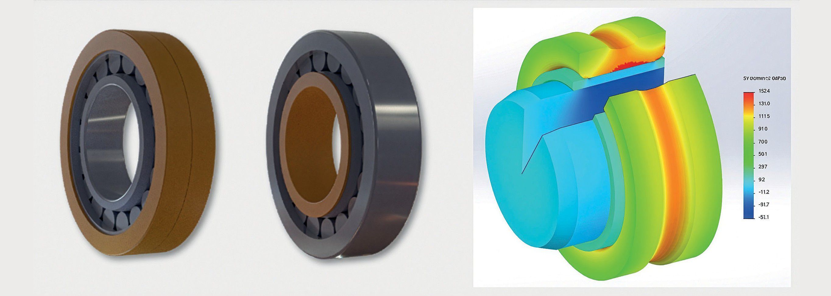 The design of the Vespel® polyimide sleeve requires studying the different press-fitting scenarios and checking that the loads resulting from the press-fitting of the various parts, combined with thermal expansion, are acceptable (Figure 1). Bearing manufacturers typically provide maximum hoop stress and radial stress; this information is used to properly dimension the Vespel® polyimide sleeve. Although proper testing needs to be conducted on the final system to ensure the parts behave appropriately, simulations are used to build confi-dence and quickly design a working prototype (Figure 1).