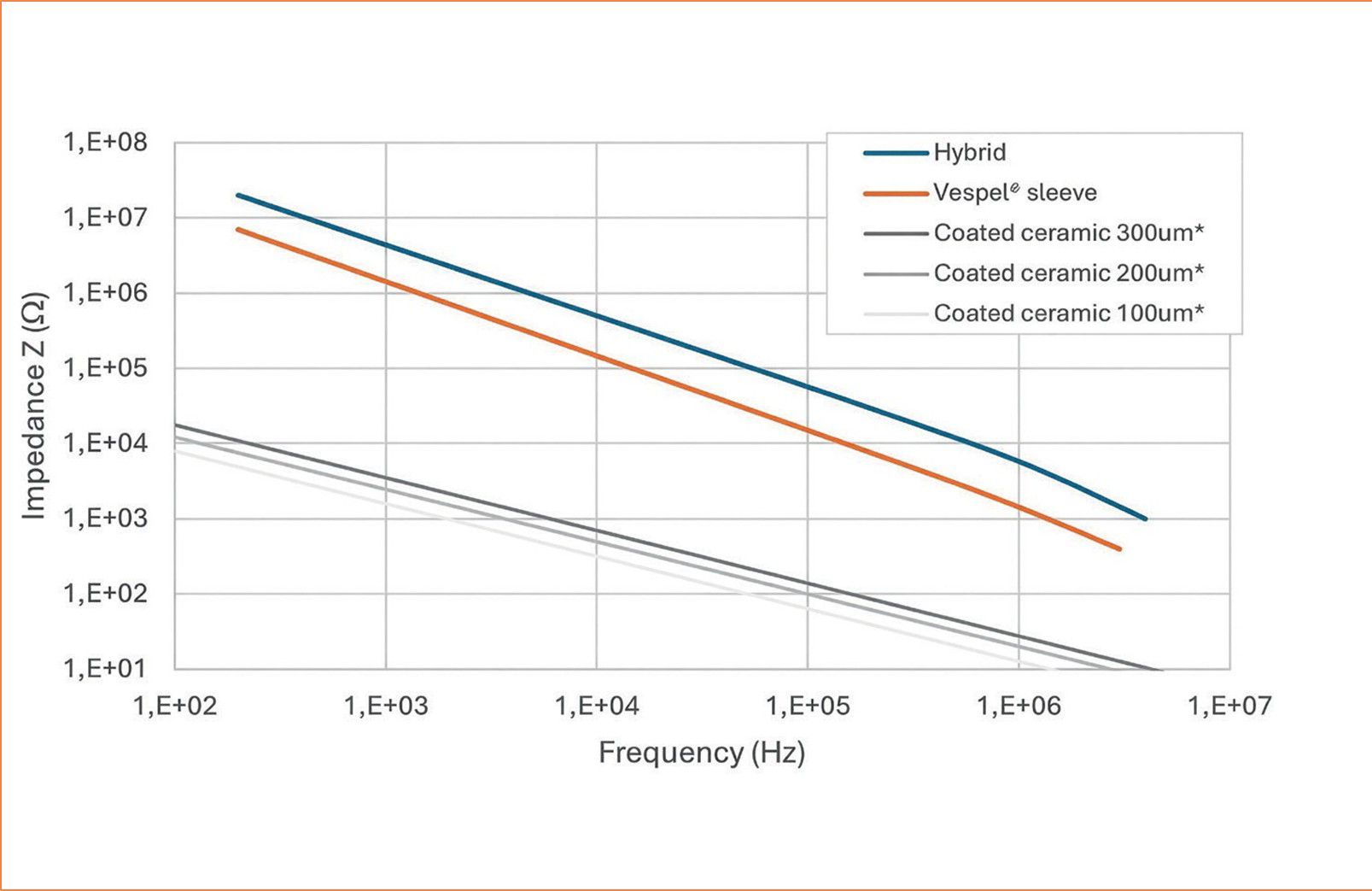 Various tests have been conducted to support the use of Vespel® sleeves in addressing electrical corrosion issues. The electrical impedance has been measured by IMKT (Institut für Maschinen-konstruktion und Tribologie at Leibniz Universität Hannover). Results indicate that the electrical insulation performance of Vespel® SP-1, although slightly lower than that of the hybrid bearing, remains in the same order of magnitude and significantly higher than the ceramic-coated bearing solution [8], even when compared to the thickest layer of ceramic coating (Figure 2).