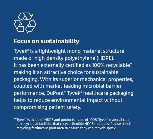 The robust sterile barrier package design was key to realizing these efficiencies while also reducing the risk of damage incurred during shipment. With its ability to endure the challenges and hazards of transportation, Tyvek® can help reduce the risk of product damage, thereby reducing distribution costs and improving the overall sustainability of the product.