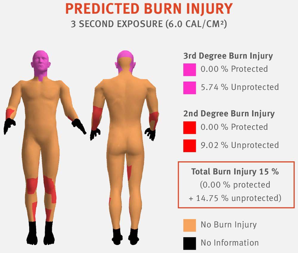 The predicted body burn injury results after a three-second burn (6.0 cal/cm2) of the 20-year-old garment made with Nomex® were: 15% total body burn with 9.02% second-degree and 5.74% third-degree burns (The predicted third-degree burns were to the unprotected face and head.)
