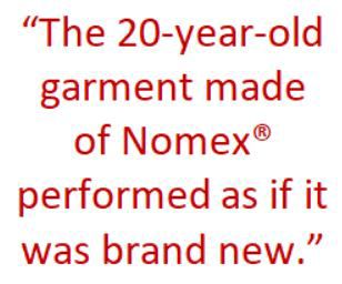 That’s because the 20-year-old garment made of Nomex® performed as if it was brand new—with the same burn characteristics and body burn injury prediction. The Nomex® fiber had not broken down or lost its characteristics. Even after all those years in service, it performed like new.