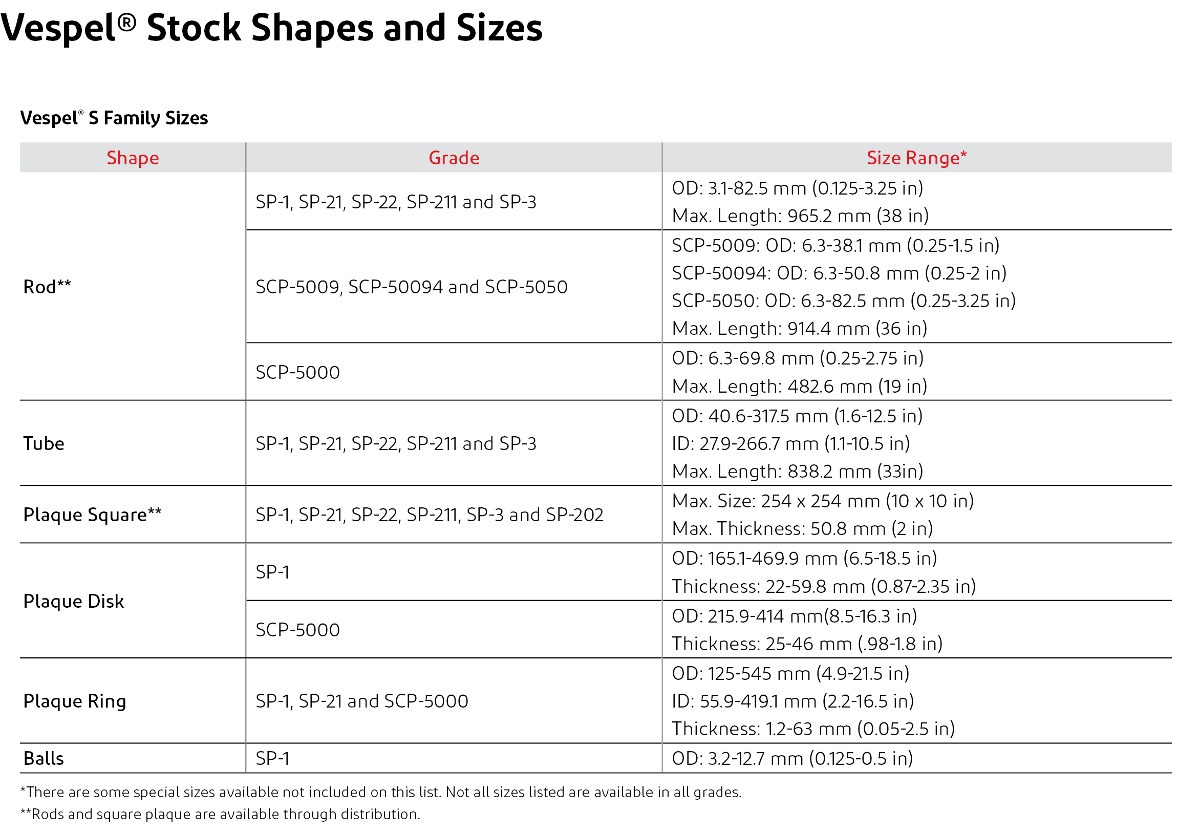 Vespel® stock shapes are a combination of material composition, geometric size/shape and process method manufactured only by DuPont. Shapes manufactured by other companies machined to the same size as Vespel® stock shapes may not deliver the same performance of Authentic Vespel® stock shapes. Ensure you are getting Authentic Vespel® stock shapes.
