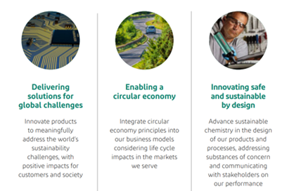 Innovate for good is our commitment to use our talent, resources, and innovation expertise to work on meaningful and valuable solutions to societal challenges. We address the world’s most pressing sustainability challenges by delivering innovative solutions in four key impact areas: climate action, enabling a more circular economy, creating products that are safe and sustainable by design, and advancing water stewardship. Our customer engagement initiatives help us understand our customers’ needs from each of our global businesses and shape our innovation priorities and investments to meet them.
