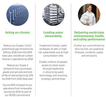 We developed our sustainability strategy with our purpose in mind—to empower the world with the essential innovations to thrive. With the three pillars mentioned above (innovate for good, respect for people and the planet, and empower people to thrive), we are working toward nine specific goals designed to be challenging and provoke technical breakthroughs and new solutions for addressing our customers’ and society’s biggest challenges.
