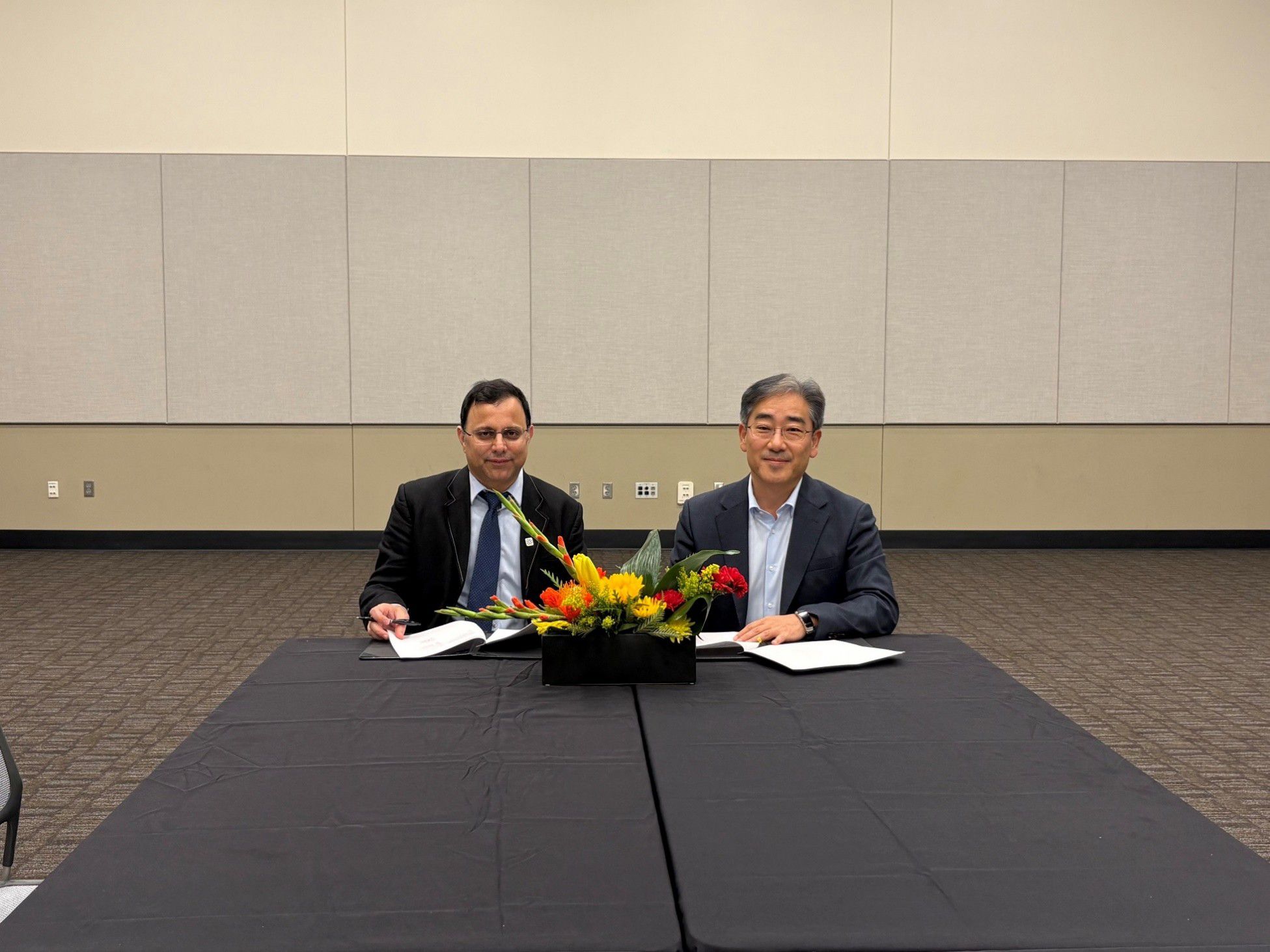 Sanjay Kotha, Global Business Director, CMP Technologies, Qnity™, DuPont Electronics (left) and SeongHan Kim, EVP, Head of Procurement, SK hynix, participated in the signing ceremony on Oct. 7, 2025, during SEMICON West in Phoenix, Ariz.
