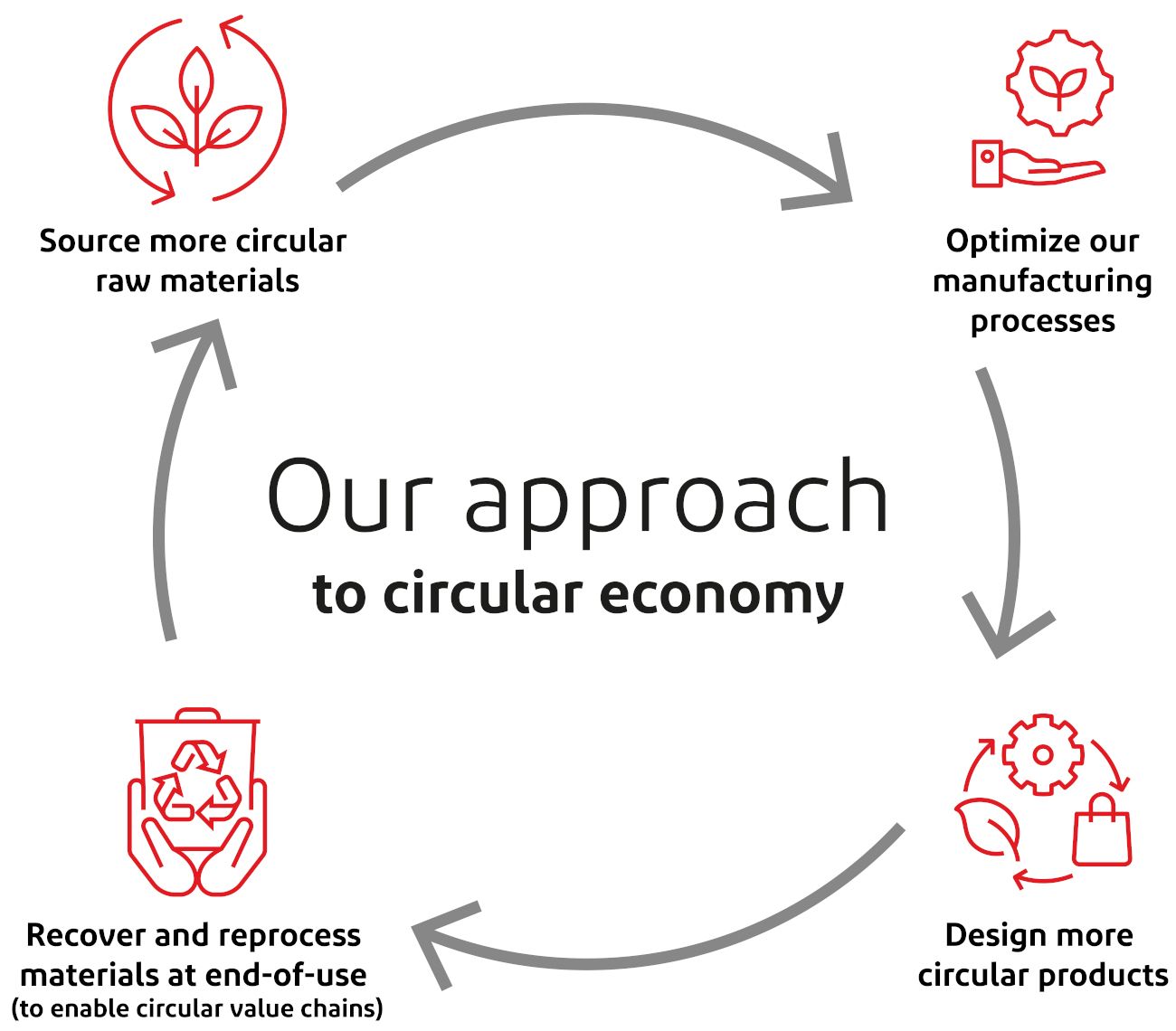 Our circular economy approach guides how we address waste, material use efficiency, and design challenges across our innovation platforms and global businesses. Our approach defines how to incorporate circular economy principles at four different points in product life cycles. Each stage in the product life cycle requires different types and levels of investment and presents both unique and complementary challenges.