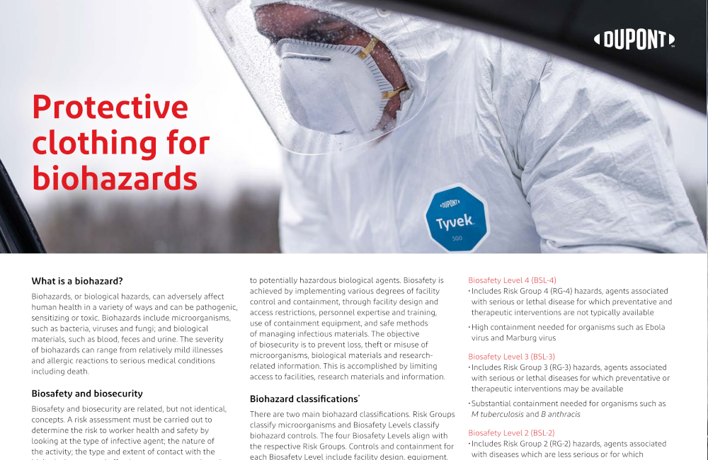 This is where DuPont Personal Protection can help. We have the largest portfolio of garments and accessories from ProShield® light dirty job protection, Tyvek® durable protection, to Tychem® Level A and Level B suits. We have an unmatched chemical permeation database and hazard selector tool called SafeSPEC™ that can help guide one through the selection process.