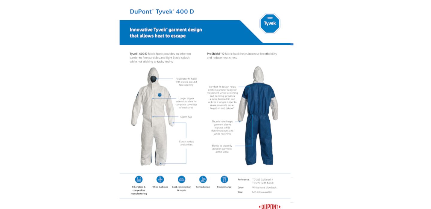 DuPont™ Tyvek® garments provide exceptional protection, durability, and comfort, making them a premier choice for PPE in the boat manufacturing industry. Designed to withstand the rigors of high-usage environments, these garments effectively protect against exposure to glass fibers, fine dust, and hazardous chemicals.