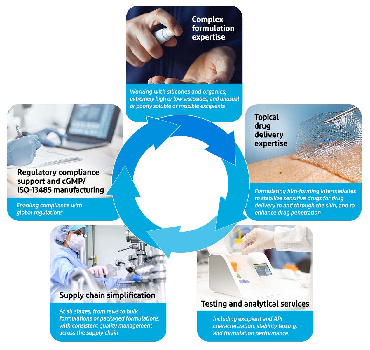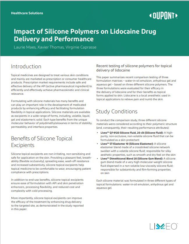 Formulations with silicone material offer various dosage forms and textures; they also provide efficient drug delivery, proven aesthetics, functional film characteristics and long-lasting effects that are well-adapted for different skin diseases. In terms of patients’ compliance with treatment, the optimized efficiency of drug delivery and the behavior of silicone-containing formulations on skin can lead to better perceived efficacy and a more pleasant sensory feel, encouraging greater compliance.
