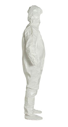 DuPont™ Tychem® 4000 Coverall. Respirator Fit Hood. Elastic Wrists. Attached Socks with Outer Boot Flaps. Storm Flap with Adhesive Closure. Taped Seams. Semi-auto locking slider zipper pull. White.