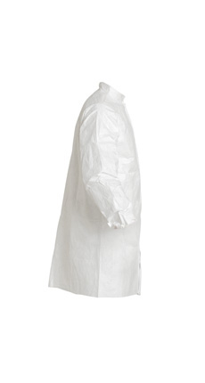 DuPont™ Tyvek® IsoClean® Frock. Bound Seams. Bound Neck. Set Sleeve Design. Covered Elastic Wrists. Front Snap Closure. White.
