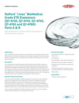 **It is the user’s responsibility to ensure the safety and efficacy of these materials for all intended uses. While these materials have passed screening tests that are applicable to products intended for implantation for up to 29 days, DuPont makes no end-use representation based on such testing. Nor does DuPont make any representation concerning the suitability of these products for applications of greater than 29 days of implantation in the human body.