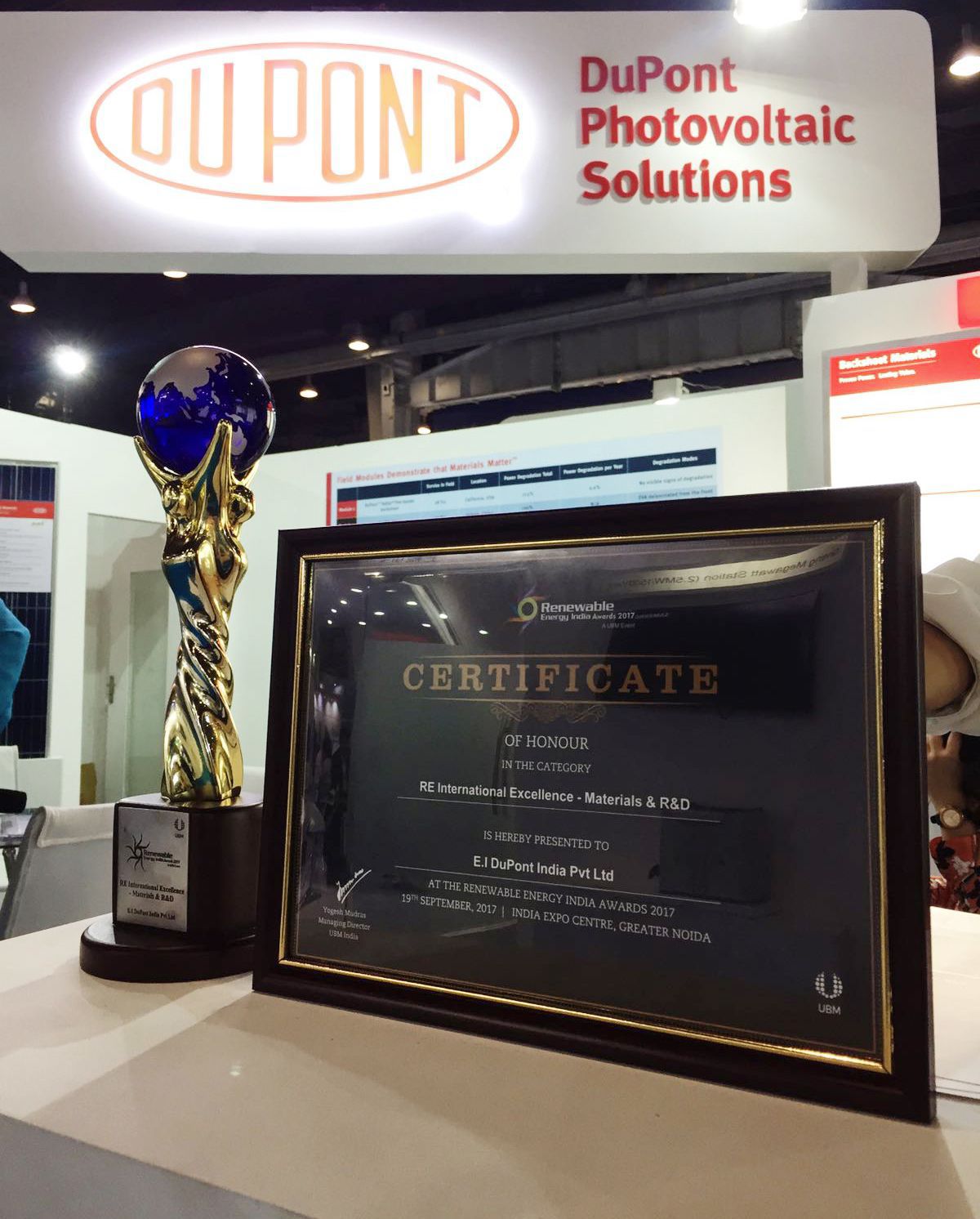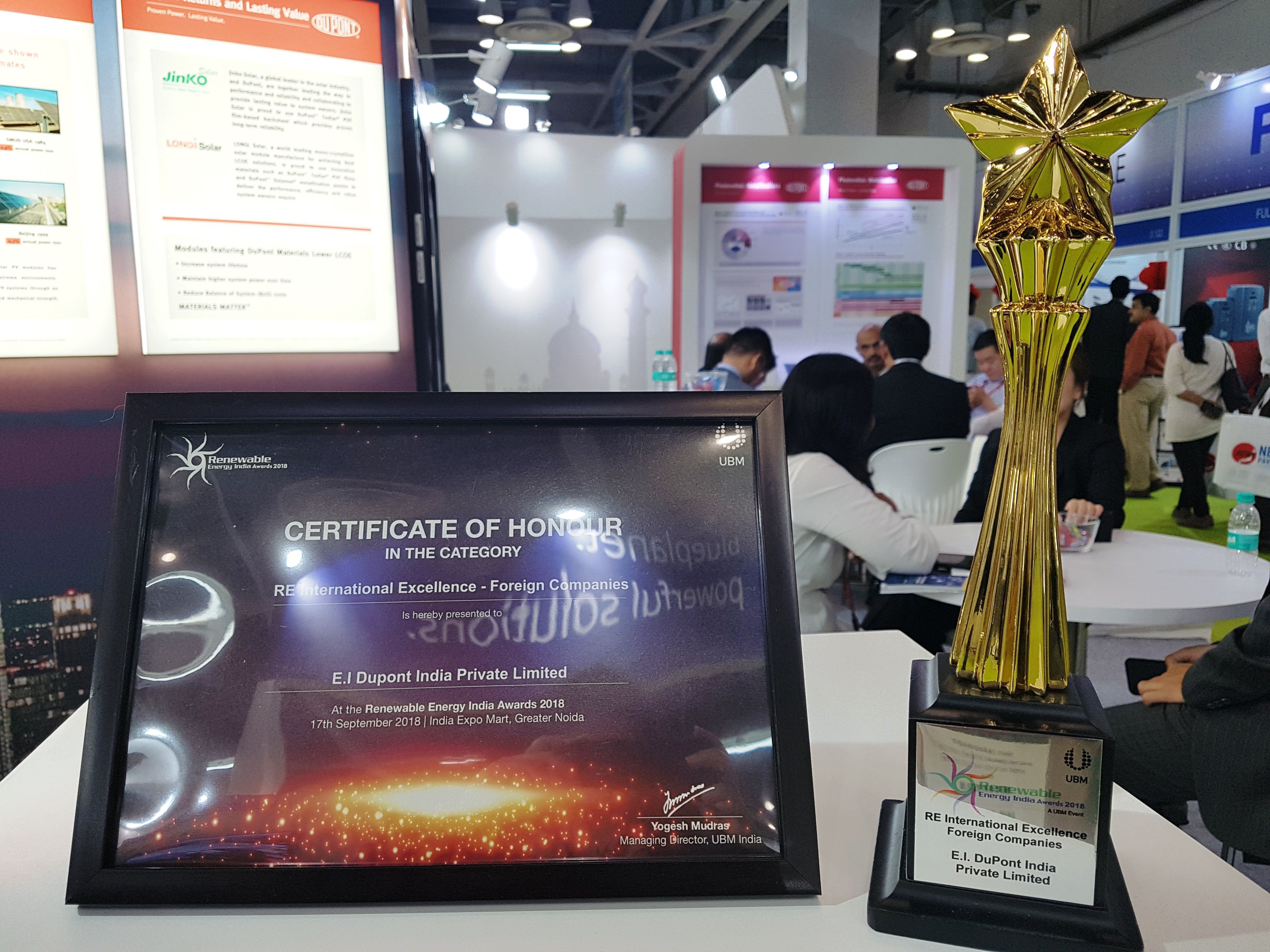 DuPont wins the REI award in the “Renewable Energy International Excellence in Materials and R&D” category. DuPont is showcasing the highly efficient and durable materials with field-tested reliability at the 2017 Renewable Energy India Expo (REI), India Expo Center, Greater Noida, September 20-22. The latest solar innovation in its portfolio, DuPont™ Solamet® PV20A, is featured at DuPont’s highly engaging booth, 10.42 (hall 10).