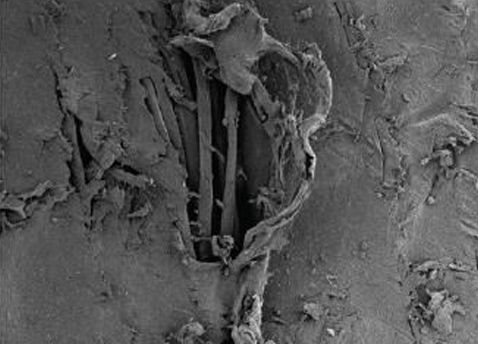 TYPAR® laminated house wrap is made from polypropylene fiber mesh with a fragile coating. The polypropylene is tear resistant but offers no protection against water and air penetration. Micrographs of test results show how the surfaces of TYPAR® and Tyvek® stood up to just one cycle of abrasion.