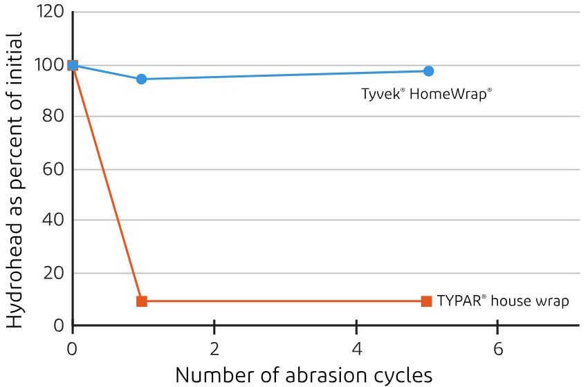 TYPAR® lost most of its effective water resistance after one abrasion cycle. The water resistance of Tyvek® was not significantly affected after five abrasion cycles.