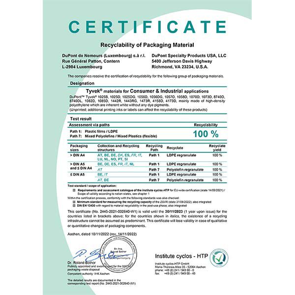 An independent analysis and assessment of the recyclability of DuPont™ Tyvek® styles for Consumer & Industrial applications was conducted by Institute cyclos-HTP. As a result, DuPont™ Tyvek® 1025B, 1025D, 1025DG, 1056D, 1056DG, 1057D, 1058D, 1070D, 1073D, 8740D, 8740DL, 1082D, 1085D, 1442R, 1443RG, 1473R, 4158D, 4173D, have been certified as 100% recyclable. ↓↓↓ Download the Certificate